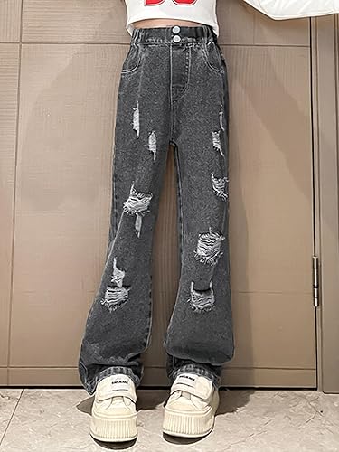 Wide-leg jeans for girls, star printed, ripped details at the bottom of the pants, unique and stylish