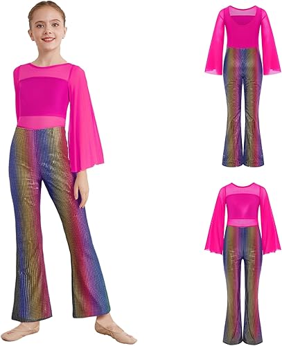 FEESHOW Girls Metallic Plaid Mesh Splice Dance Unitard Long Flared Sleeve Bell Bottom Jumpsuit Full Body Disco Romper Hot Pink 16 Years