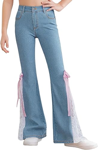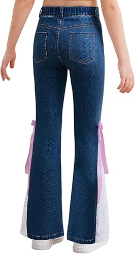 FEESHOW Kids Girls Lace Patchwork Bow Flared Jeans Y2k Denim Pants Bell Bottom Stretchy Jeans Trousers with Pocket(Dark Blue,10 Years)