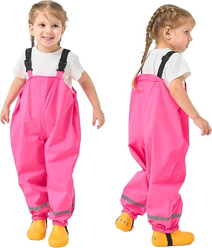 Comfortable fit: With elastic shoulder straps and snap buttons at the sides, while the over-the-shoulder bib design stays in place during active play. Our toddler rainpants offer a flexible and adjustable fit, allowing for unrestricted movement and all-day comfort.