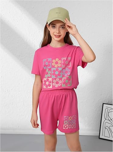 Feature: Floral print, crew neck, short sleeves, elastic waist, t shirts and shorts, 2 piece sets for girls