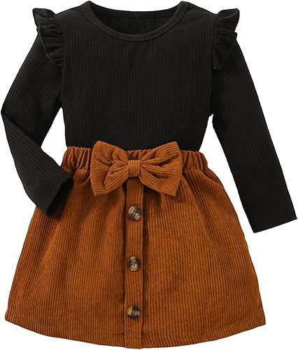 Feature: Rib knit, long sleeve, ruffle trim, bow front,corduroy skirts, two piece outfit