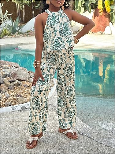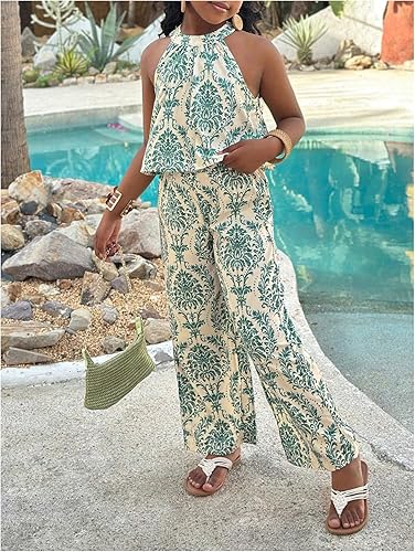 Features: Paisley print, sleeveless, halter neck, wide leg, long pants, two piece clothing set