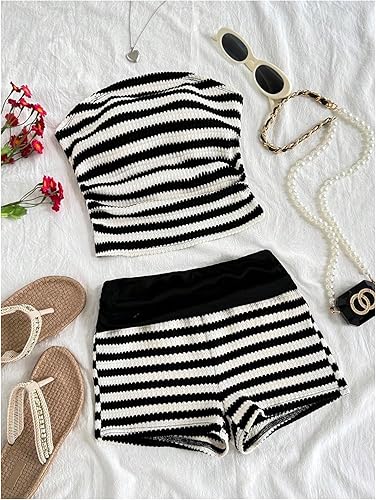Features: Rib knit, strapless, striped print, tube top, low rise, shorts set, two piece outfit for girls