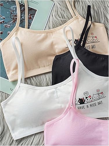 The bra features cartoon and letter graphics, cami cropped, removable chest pad, seamless, 4 packs