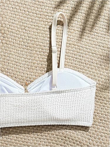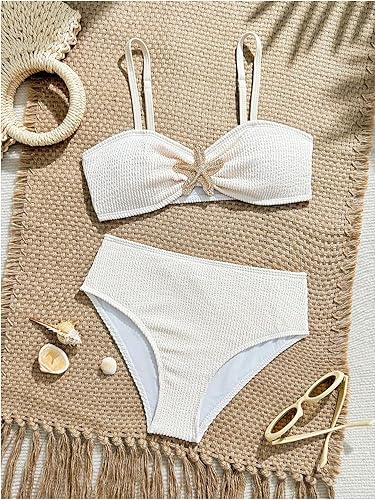 Features: Starfish metal, spaghetti strap, textured detail, mid waist, 2 piece bikini swimsuit