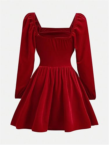 Feature: Lantern long sleeve, square neck, zipper up, ruffle hem, a line dress