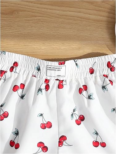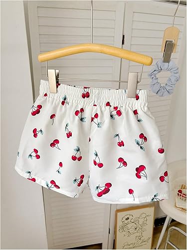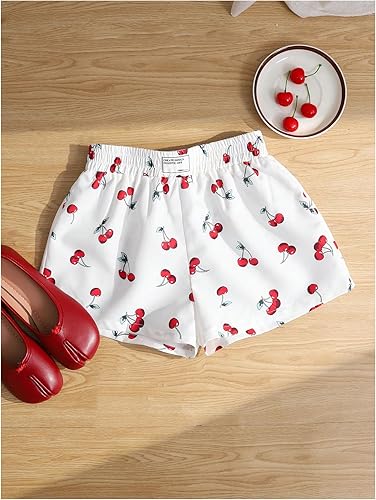 Feature: Cheery print, straight leg, elastic waist, casual, comfy, cute, summer shorts for girls