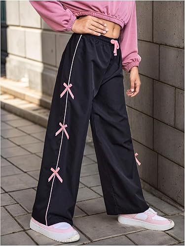 Feature: Drawstring waist, bowknot side, wide leg, loose fit, kawaii track pants