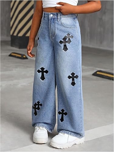 Features: Cross print, mid waist, straight leg, zip up, y2k jeans
