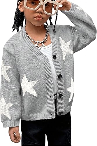 Feature: Long sleeve, button front, star print, v neck, drop shoulder, girls cardigans