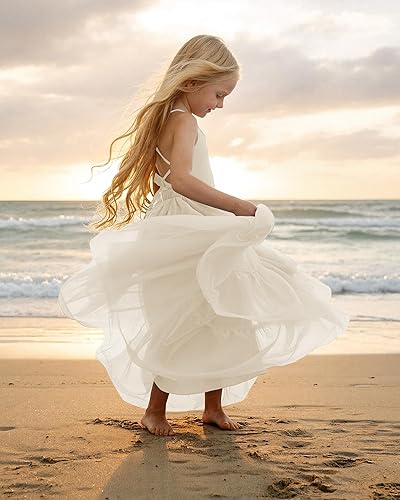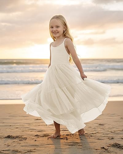 FEATURES: maxi length, tulle material, solid color, A-line, full lining, sleeveless, backless, crew neck, spaghetti straps. This toddler girl's princess dress features tie straps and a flexible smocked back, making it easy to wear. Available for beach, holidays, or daily wear, this is a dress she's sure to love. This boho flower girls semi-formal dress is available for 2-12-year-old girls
