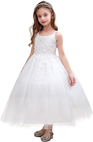 Flower Girl Dress for Wedding Lace First Communion Dresses Kids Birthday Party Pageant Ball Gown(White,2-3T)