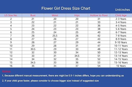Size Select: Flower girl dresses design for kids girl aged from 2-16; please refer to our size chart carefully before ordering, and figure out fit size to create a truly enchanting appearance, making your girls looks like an adorable princess