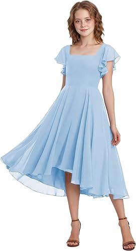Features: Junior Bridesmaid Dresses for Girls, A-Line, Flower Girl Maxi Chiffon Dress, Square Neck, Split/Slit, Zipper Back, Ruffles Sleeve, Floor Length, Pleated High Waist, Charming Princess Dresses.