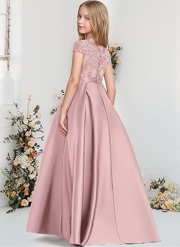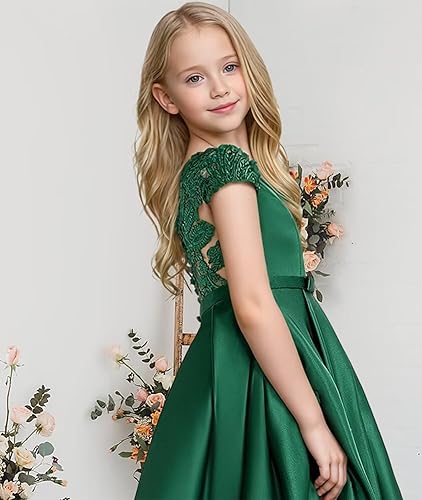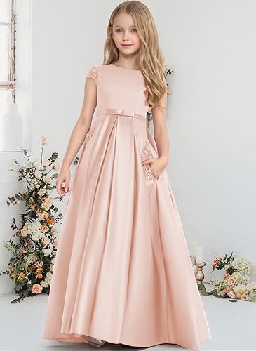 FEATURES: Cute Flower girls dress features O-neck pleats ,Soft and two-layer Satin skirt design with appliques lace. Elegant Girls princess party dress with pockets, kids prom party and wedding guest dress for junior,semi formal.