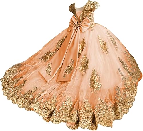 Exquisite Design: Princess Girls 3D Flower Gold Lace Appliques Pageant Dress Flower Girl Dresses for Wedding Ball Gown Kids Tulle Lace Toddler First Communion Dress Ruffles Beaded Wedding Party Dress Tiered Cap Sleeve Birthday Prom Dress Ball Gown for Little Girls, 3D Floral Flower Girl Dresses, Lace Appliques Kids Ball Gown with Train, Sparkly Tulle First Communion Dress for Wedding, Glitter Princess Pageant Dresses, Long Ball Gown for Formal Party