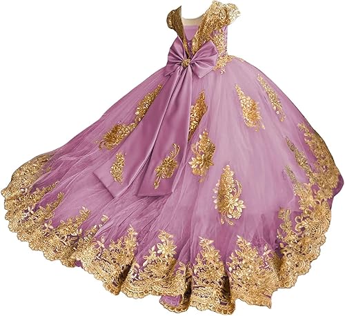 Easy Care Girl's Dress: Gently Hand Wash in Cold Water/do Not Bleach/hang or Line Dry. 3D Gold Lace Applique Tulle Flower Girl Dress Ball Gown Dress for Girls Off Shoulder First Communion Dress for Girls Pageant Princess Dress for Girls Flower Girl Dresses for Wedding
