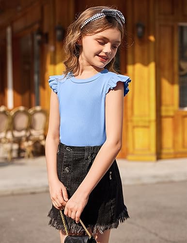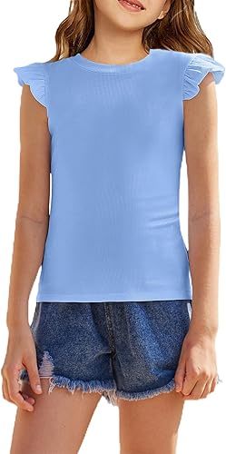 Feature: Sleeveless t-shirt top, crewneck, ruffle sleeve, ribbed knit, solid color, lovely short sleeve shirt for girls. Fashion and trendy, add beauty to your wardrobe.