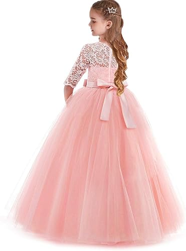 Celebrate your princess special day in style with FMYFWY's girls embroidery tulle 3/4 sleeve lace flower girl wedding maxi dresses pageant formal evening party ball gown.