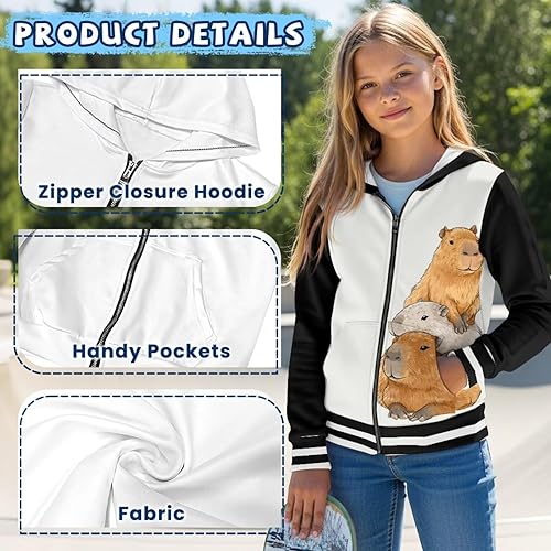 Forchrinse Cute Zip Up Hoodies for Girls 6-16 Casual Hooded Jackets Kids Long Sleeve Zipper Sweatshirt with Pocket(Capybara,11-13 Years)