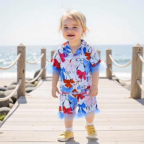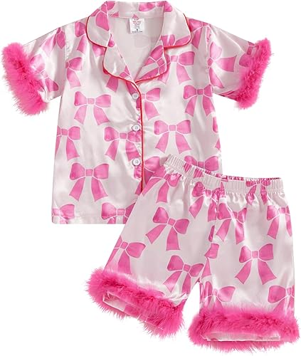 Design:Kids pajamas girls,toddler summer pajamas,silk toddler pajamas,girls pajama shirt,crew neck,short sleeves,feather trim patchwork cuffs,Lobster/Cherry/Bowknot print,lapel collar and front button closure down shirts,pajama bottoms shorts,pajama shorts with elastic waist for easy fit,toddler girl silk pajamas,flower girl pajamas,satin toddler pajamas,feather pajamas kids,girls feather trim pajamas,satin kids pajamas girls,fashionable and playful design,make your baby stand out in the crowd