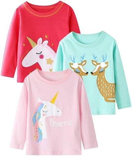 Girl Long Sleeve Shirts Christams Tops Tees Cotton Casual Stripe Crewneck Graphic Jersey Tunic T-Shirts 3 Packs Sets(G3packs1#unicorndeer,4T)