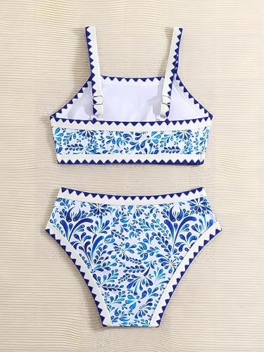 2 Piece Swimsuit For Girls With Bohofeel--cute bikinis for teen girls is completed with floral scoop neck top and high waisted bikini bottoms. Crafted with whip stitch and piping design along the edges, this girls 2 piece sets summer showing a boho style,which is your best choice to go to vacation and beach