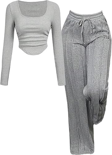 Features: Girl's 2 piece set, long sleeve t shirt and pants set for girls, square neck, wide leg, ribbed knit, casual style