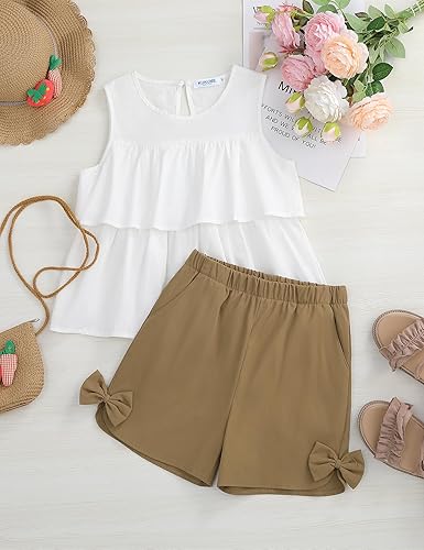 Cute Design - Two piece outfit for girl, the top is featuring crew neck, sleeveless, solid color, layered ruffle details and the shorts features elastic waist, 2 cute bows at each side and 2 pockets.