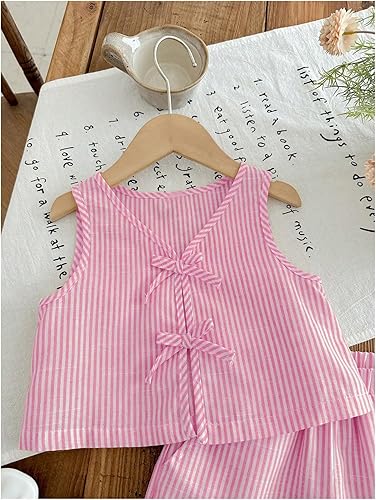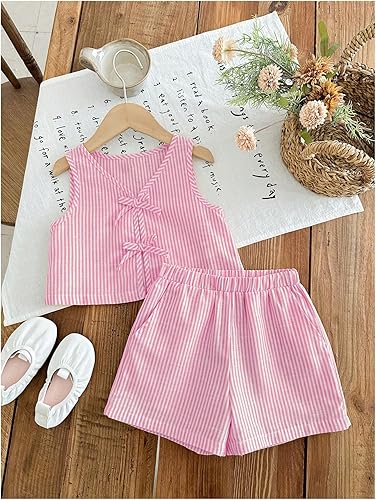 Features: Girls clothes, striped summer outfits for girls, 2 piece set, bowknot, sleeveless, v neck, tank top and shorts set