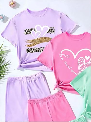 Features: Two piece outfits for girls, 3 sets, heart print, leopard print, short sleeve, round neck, elastic waist, straight leg, casual