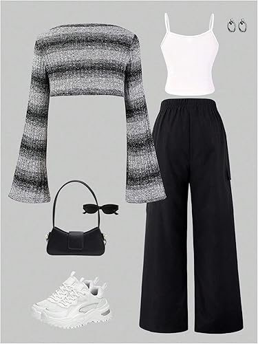 Features: Girls clothes, girls' clothing sets, 3 piece set, cami top and wide leg pants with bell sleeve gradient crop top set, casual street style, fall outfits for girls