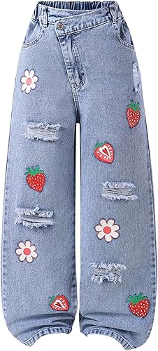 Features: Cute baggy jeans for girls, bowknot graphic, ripped, distressed, wide leg, loose fit