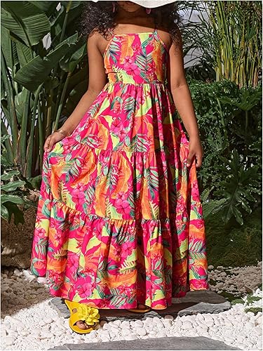 Features: Floral print, sleeveless, square neck, tiered, bow back, flared hem, maxi length, high waist, flowy dress, boho dresses for girls