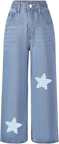 Girl’s Graphic Denim Pants High Waist Loose Fit Y2K Casual Jeans(Blue Plaid Star,10 Years)