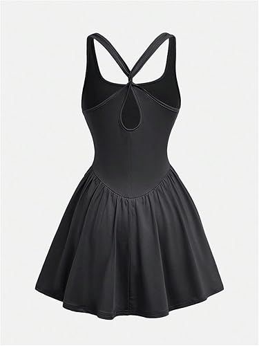 Features: Sleeveless, cami dress, square neck, criss cross back, racer back, flared hem, short length, pockets