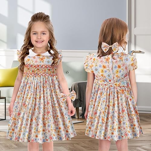 Girls Spring Summer Dress: Our girls floral dress adopts a complicated hand smocked process, each small flower is hand-sewn. Smocked dresses for toddler girls waist is designed with pleats, Add a lively touch to any little girl's wardrobe.
