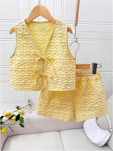 Features: Girls summer outfits, two piece set, vest and shorts set for girls, bowknot, sleeveless, v neck, jacquard
