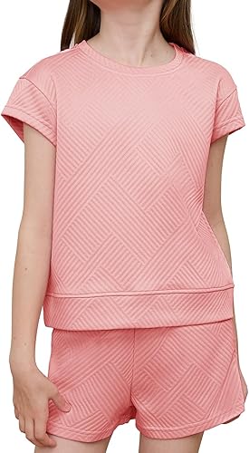 Girls 2 Piece Outfit: Short sleeve, crew neck, losse fit t shirt; elastic drawstring shorts, easy to wear and give a simple and energetic look.