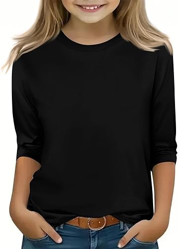 Girls 3/4 Sleeve Tshirt Solid Color T Shirts Cotton Basic Tees Tops Summer Casual Round Neck T-Shirts(Black,9-10 Years,Little Girls)