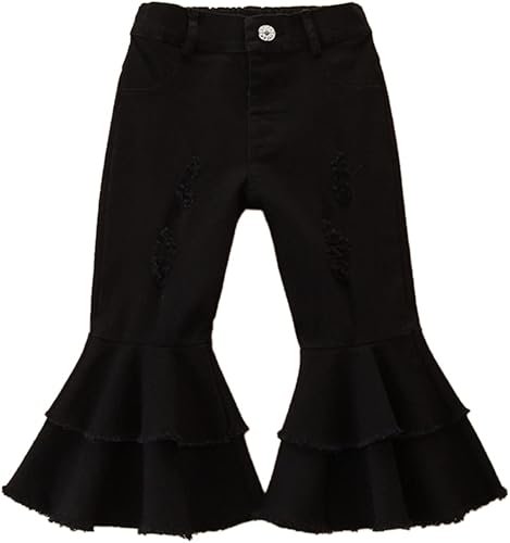 Girls and Toddlers' Ripped Flared Denim Pants Ruffle Wide Legs Jeans High Waisted Leggings Bell Bottoms Vintage Clothes(Black,5-6 Years)