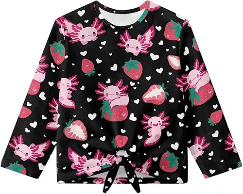 Girls Axolotl Shirts Crewneck Pullover Tops Big Litte Kids Shirt Lightweight Tie Front Knot T-Shirts(Axolotl Strawberry,11-12 Years)