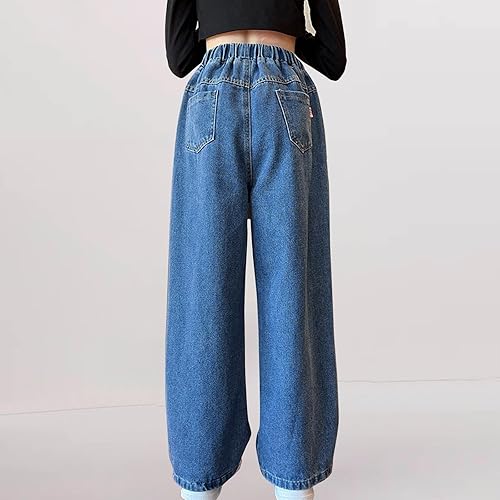 Girls Baggy Blue Jeans Straight Wide Leg Denim Pants Casual Elastic Waist Comfy Cotton Jeans Fall Winter Loose Trouser(Blue,11-12 Years)