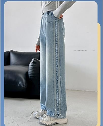 Girls Baggy Blue Jeans Straight Wide Leg Elastic Waist Denim Pants Comfy Cute Style Fall Kids Casual Loose Trouser(Blue,13-14 Years)