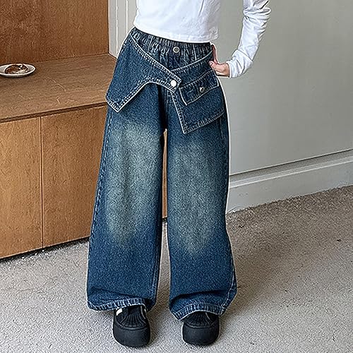 Girls Baggy Jeans Apron Overlap Front Washed Wide Leg Denim Pants Cute Y2K Trendy Stretchy Elastic Waist Trousers(Blue,11-12 Years)