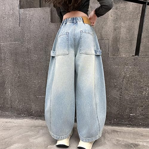 Girls Baggy Jeans Y2K Elastic Waisted Wide Leg Trousers Kids Casual Loose Y2K Streetwear with Pockets(Blue,13-14 Years)