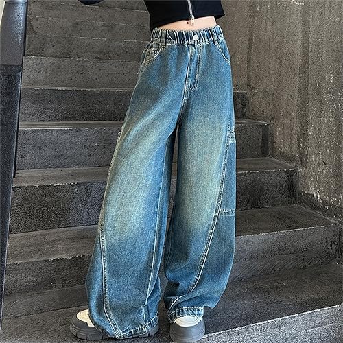 Girls Baggy Straight Leg Jeans Elastic Waist Denim Pants Preppy Trousers Trendy Y2K Hip Hop Streetwear(Blue,7-8 Years)