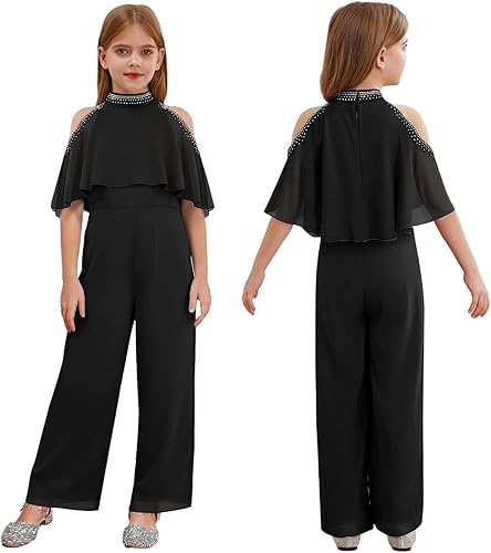 Girls Beaded Jumpsuits Dressy Casual Pants Romper Cold Shoulder Mock Neck Kids One Piece Outfits Black 6 Years