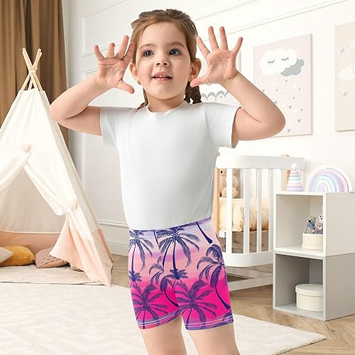 Soft cotton blend girls bike shorts with palm trees sunset purple pink print for summer wear.